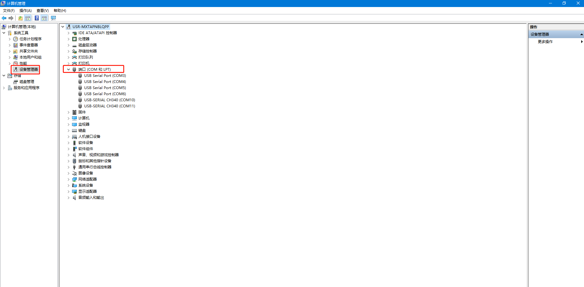 電腦鼠標(biāo)點擊計算機管理,右擊,點開設(shè)備管理器,點擊端口,查看2個USR-W660的USB-RS232串口線COM口號,COM3,COM4。