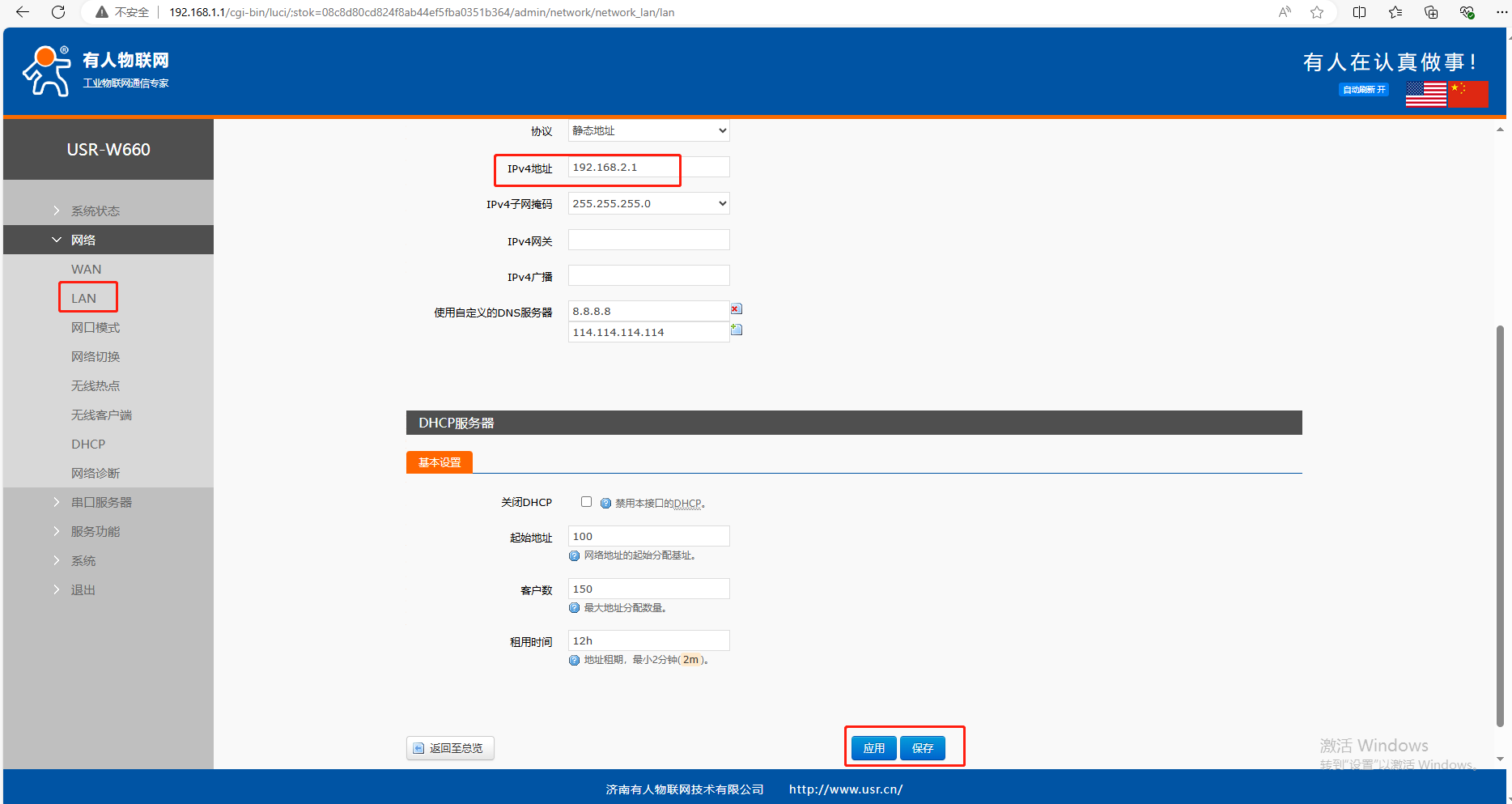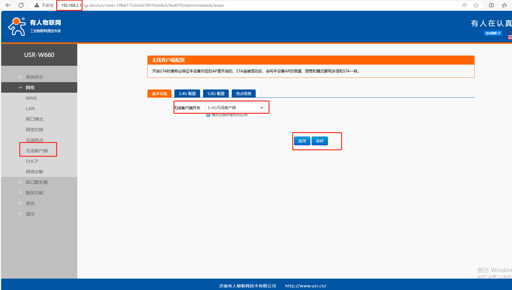 點擊2.4G配置,WiFi名稱填要連接的AP WiFi名,USR-W660-60A5,加密選擇mixed-psk,密碼設(shè)置12345678。點擊應(yīng)用、保存。