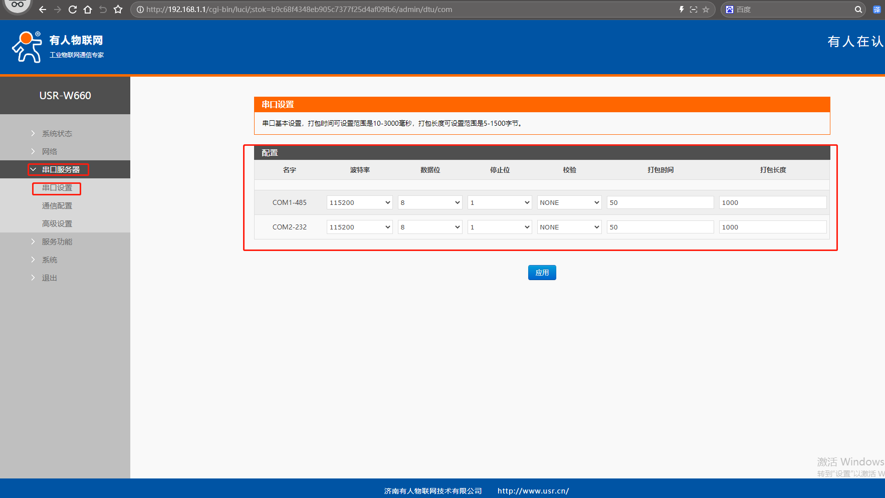 網(wǎng)頁點開串口服務(wù)器,點擊串口設(shè)置,這里可以對USR-W660的485或者232串口參數(shù)進行修改設(shè)置。本案例使用默認波特率115200。