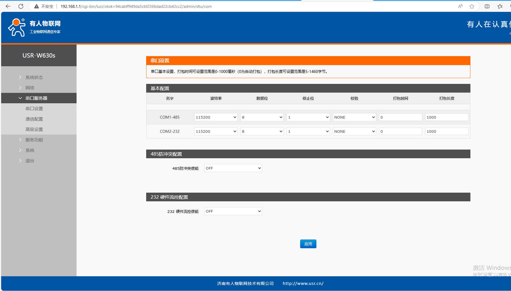 實(shí)際應(yīng)用,USR-W630s串口接實(shí)際串口從機(jī)設(shè)備,串口參數(shù)和串口設(shè)備設(shè)置一致。