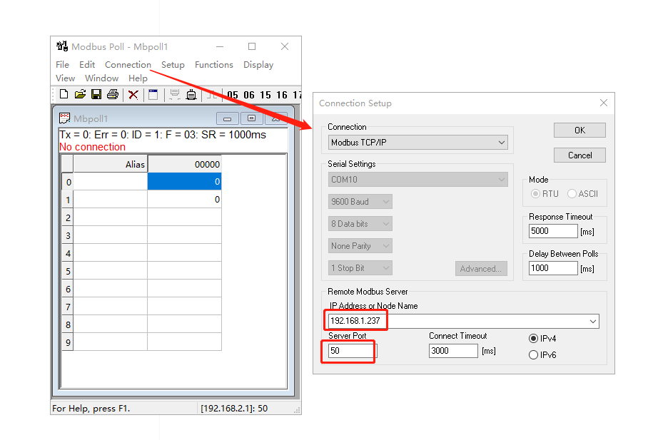4、打開MODBUS POLL軟件,點(diǎn)擊Connection,做MODBUS TCP連接USR-W630s 的IP:192.168.1.237和端口號(hào):50。點(diǎn)擊OK。