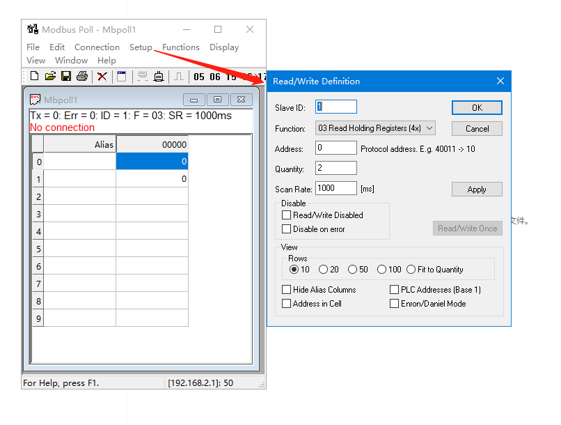 1、打開MODBUS SLAVE軟件,點(diǎn)擊Setup,從機(jī)地址Slave ID 用1,寄存器功能碼Function 用03,寄存器起始地址Address 用0,寄存器數(shù)量Quantity 用2。