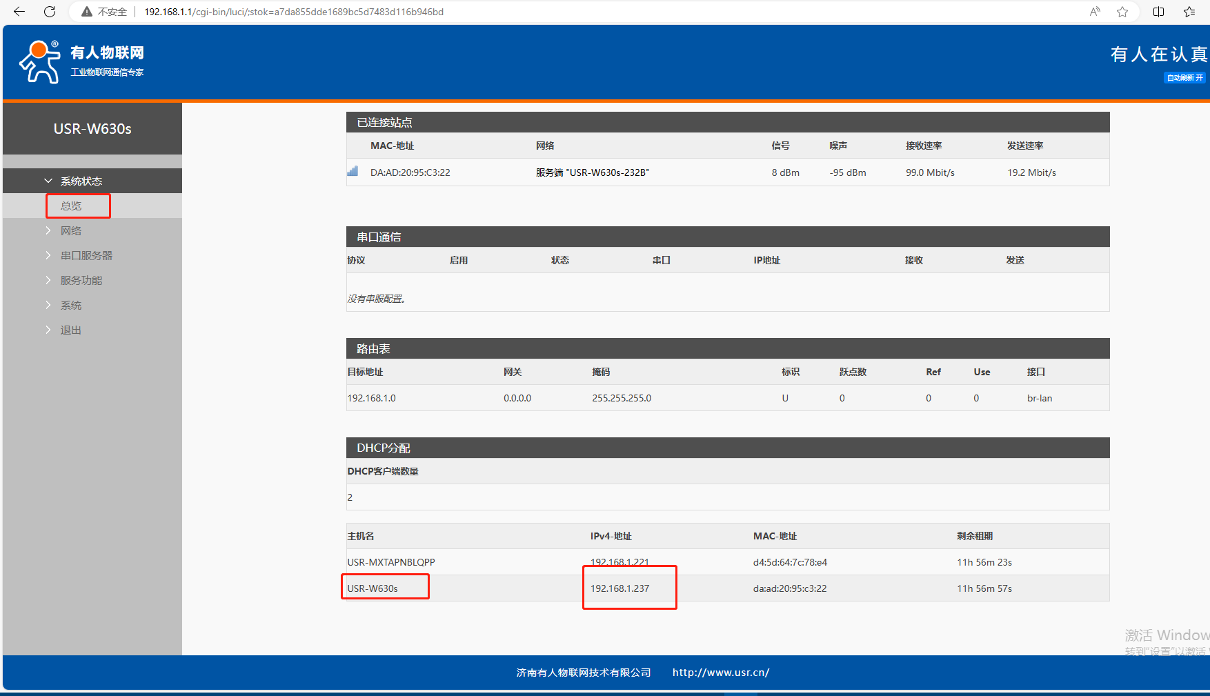 4、登陸AP的USR-W630s網(wǎng)頁(yè),查看AP分配給STA的IP 是192.168.1.237,和AP網(wǎng)口下的電腦IP同網(wǎng)段,電腦和STA的USR-W630s可以建立MOBDUS TCP通訊。