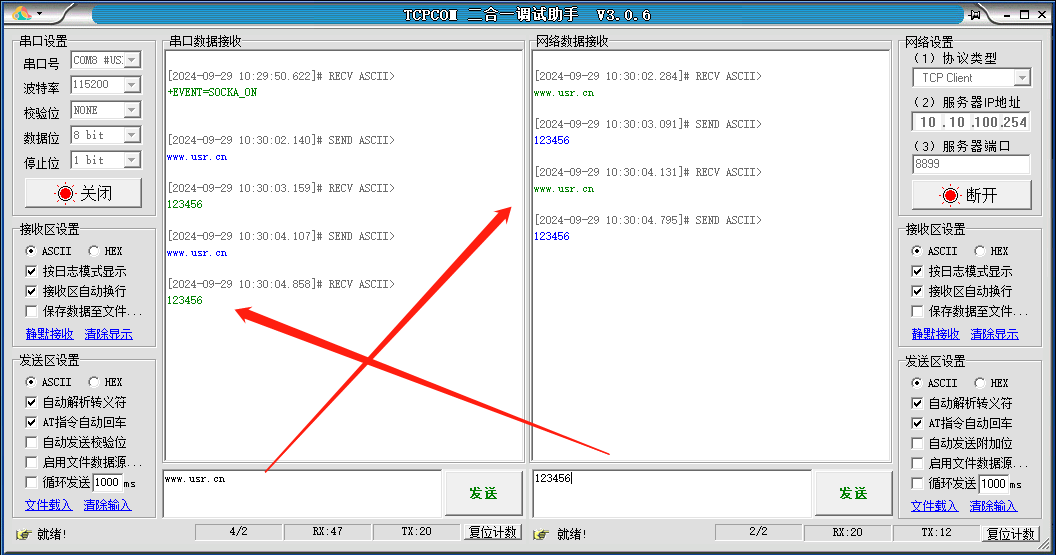 打開一個串口調(diào)試助手,引用USB轉(zhuǎn)換器COM4,和網(wǎng)絡(luò)調(diào)試助手進行數(shù)據(jù)互發(fā)測試。