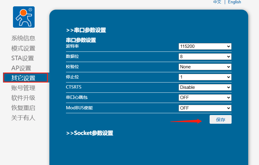 在“模式設(shè)置”設(shè)備保持AP模式,在“其他設(shè)置”界面,可以配置設(shè)備串口參數(shù)與實際要接串口設(shè)備的串口參數(shù)一致,本案例使用115200波特率,NONE無校驗、數(shù)據(jù)位8、停止位1點擊保存,先別重啟,繼續(xù)配置模塊socket參數(shù)。