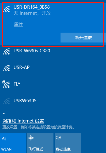 USR-DR164插上WIFI天線,接上12V電源,電腦右下角搜索USR-DR164的WIFI ,WiFi名字 USR-DR404_xxxx(xxxx 是 DR164 MAC 的后四 位 ),點擊鏈接WIFI。