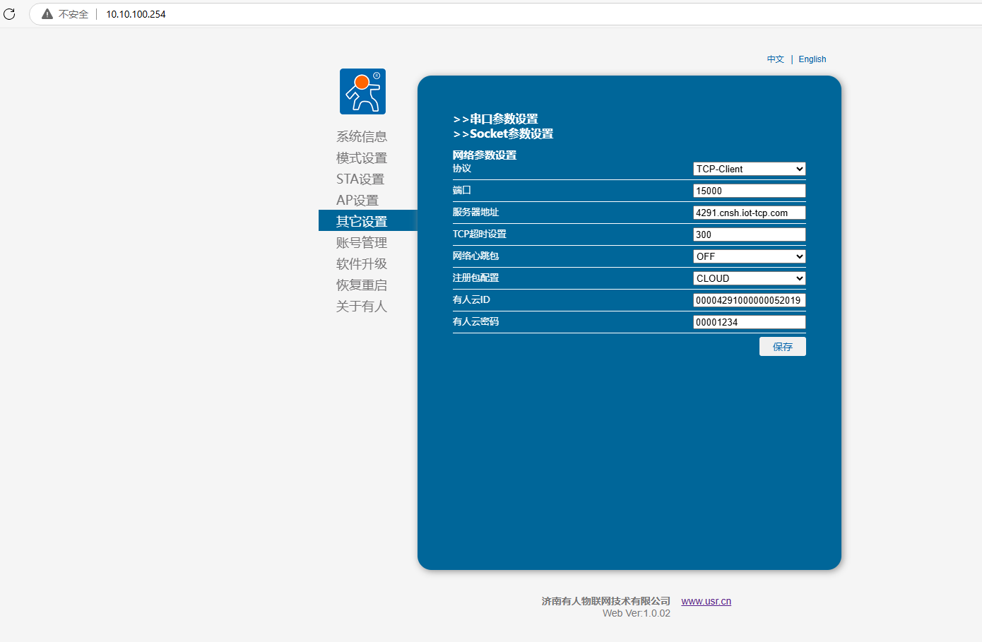 開(kāi)啟注冊(cè)包,選擇CLOUD,設(shè)備ID填添加有人云的ID 00004291000000052019,通信密碼填00001234,點(diǎn)擊保存。