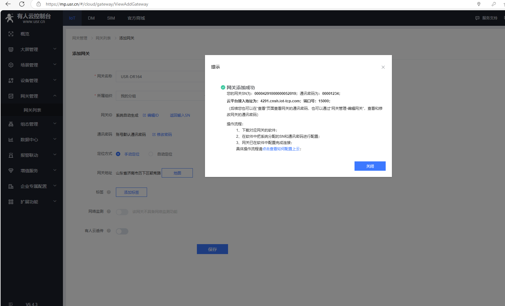 (2)USR-DR164不支持SN添加有人云的產(chǎn)品,在有人云添加網(wǎng)關(guān)的時(shí)候,點(diǎn)擊SN不支持點(diǎn)這里,自動(dòng)生成ID和密碼,有人云透?jìng)餍枰P(guān)閉,最后點(diǎn)擊保存。