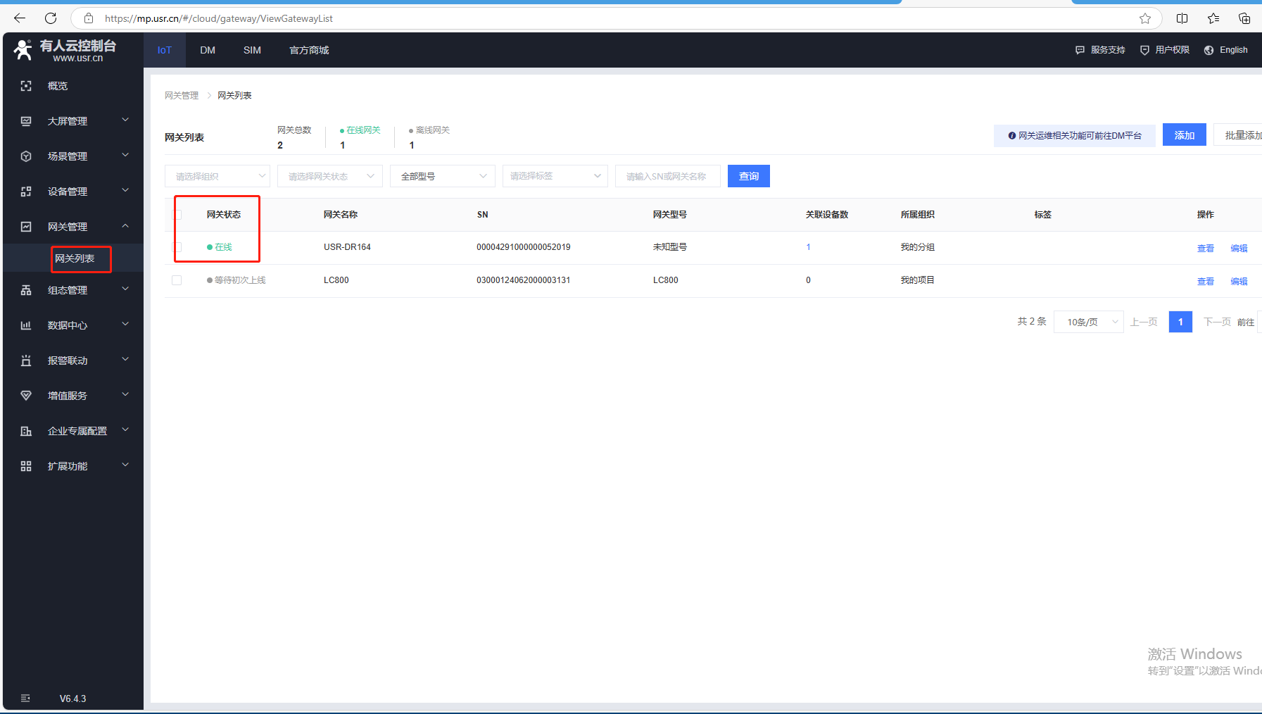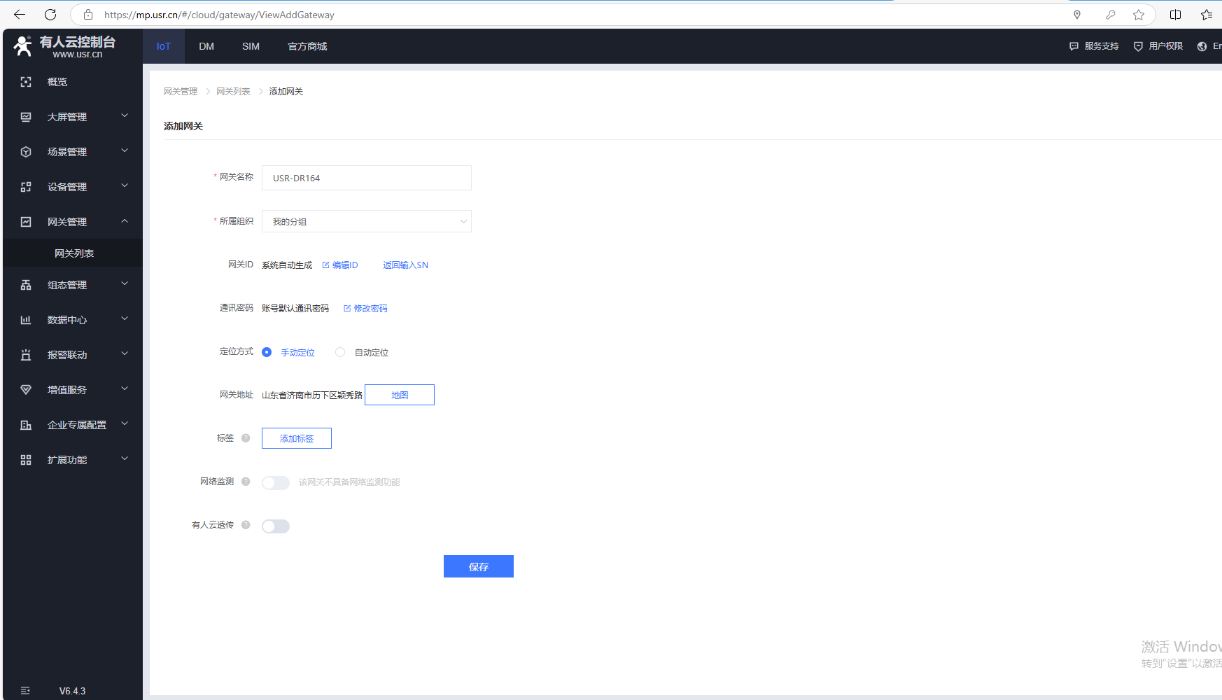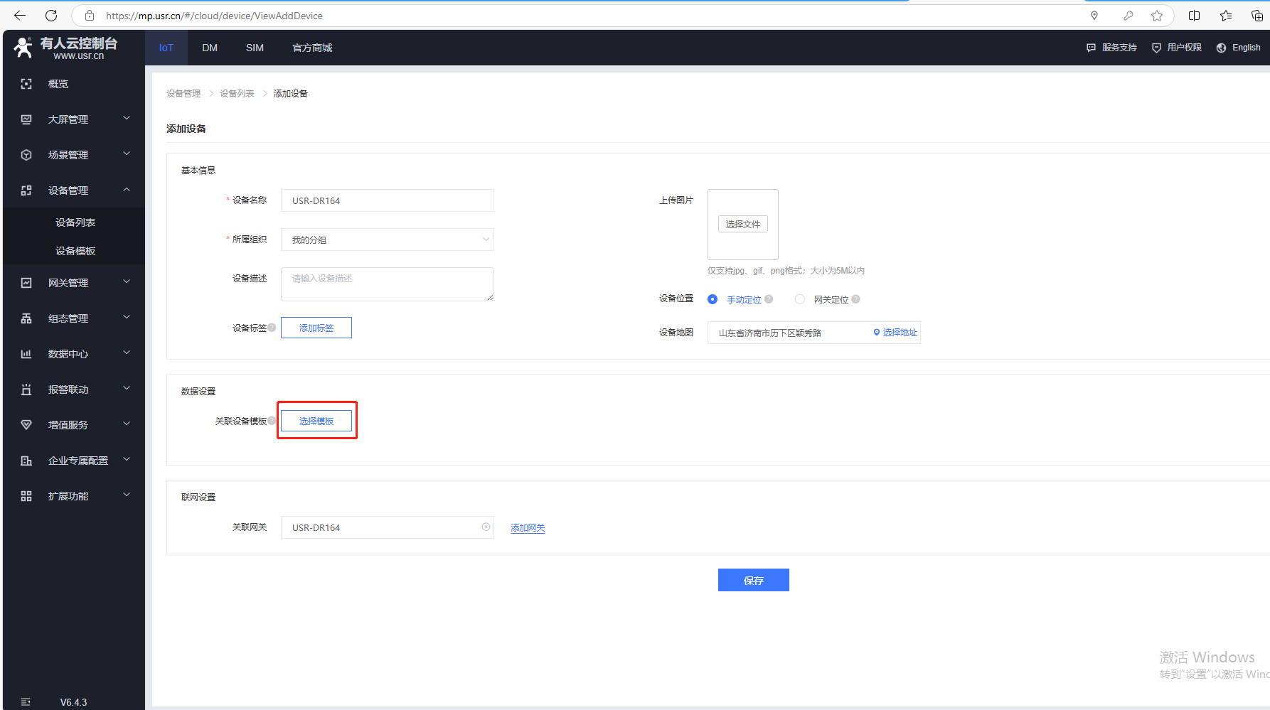 聯(lián)網(wǎng)設(shè)置,關(guān)聯(lián)網(wǎng)關(guān)選擇自身設(shè)備,USR-DR164,最后點(diǎn)擊保存。