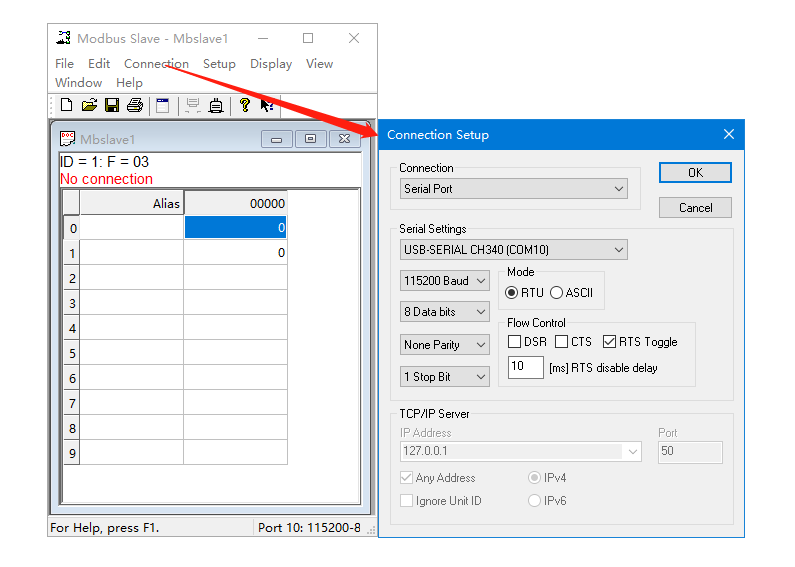 (2)點(diǎn)擊Connection,選擇串口,對(duì)應(yīng)USR-DR164所接USB-RS485串口線的COM口號(hào),串口參數(shù)和USR-DR164串口參數(shù)保持一致。 Mode選擇RTU,模擬MODBUS RTU協(xié)議串口。