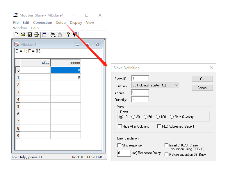 (1)點(diǎn)擊Setup,Slave ID從機(jī)地址用1,F(xiàn)unction功能碼用03,Address寄存器起始地址用0,Quantity寄存器地址數(shù)量用2。