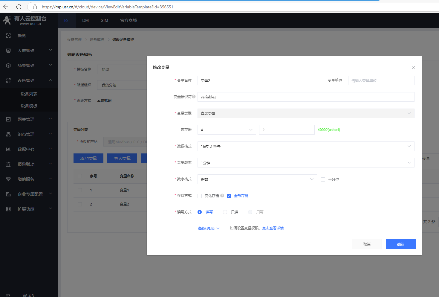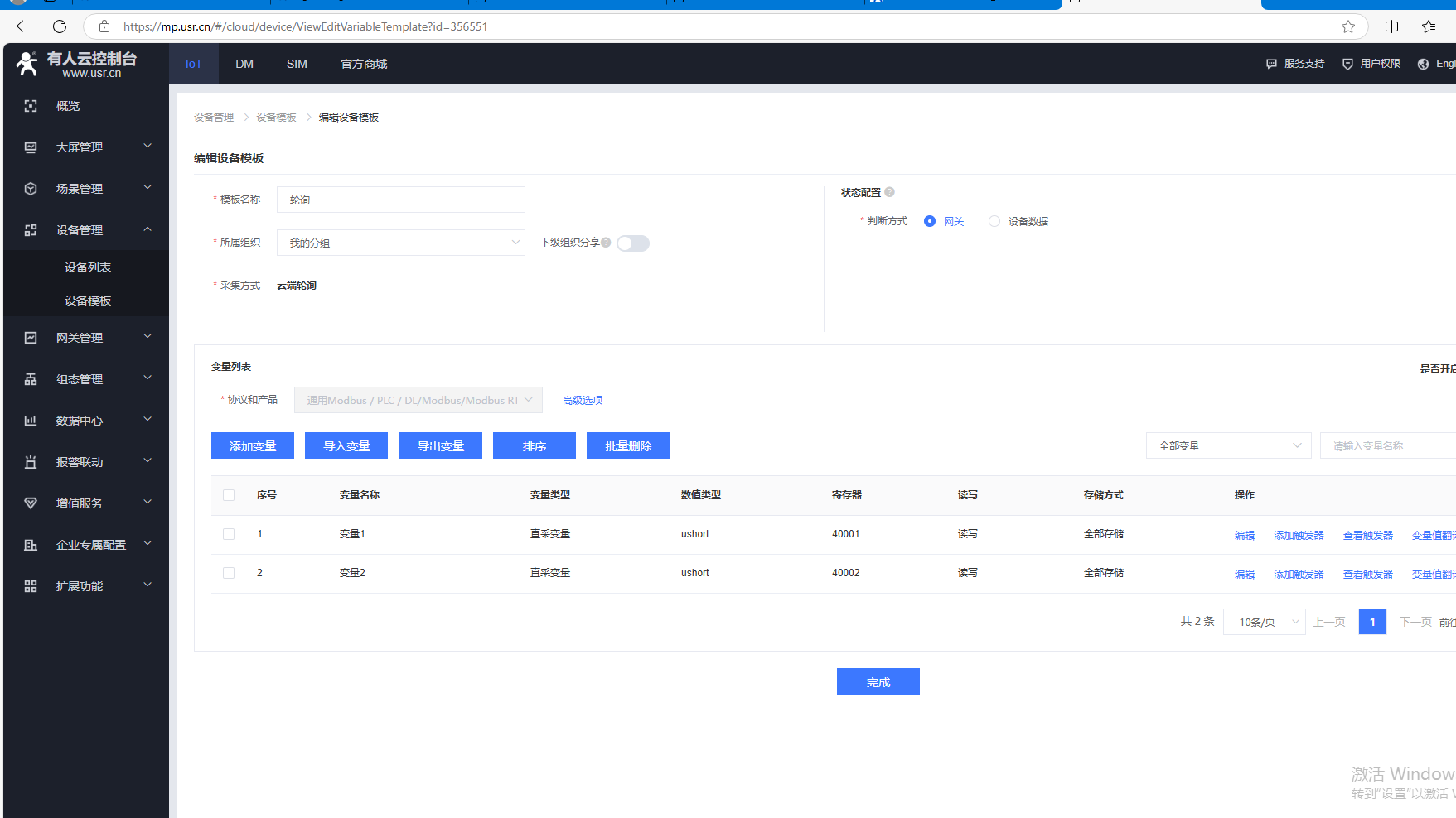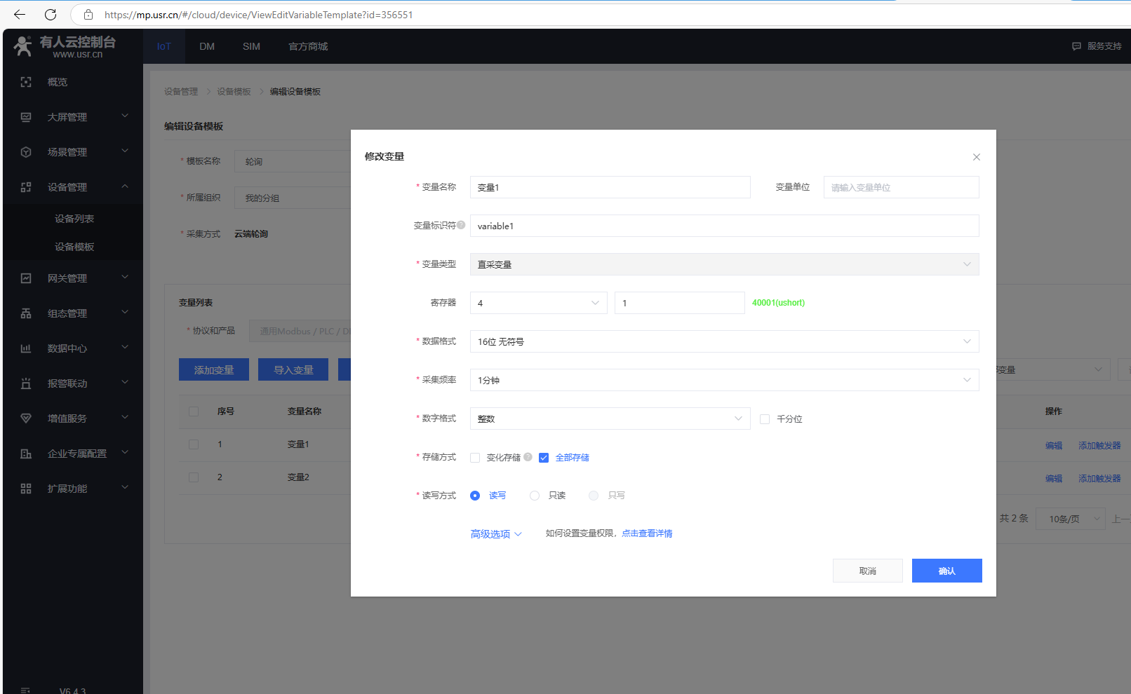 選擇新建模板,輸入設(shè)備模板名稱,通用Modbus/PLC/DL,選擇Modbus,協(xié)議選擇Modbus Rtu,采集方式云端,最后確認(rèn)。