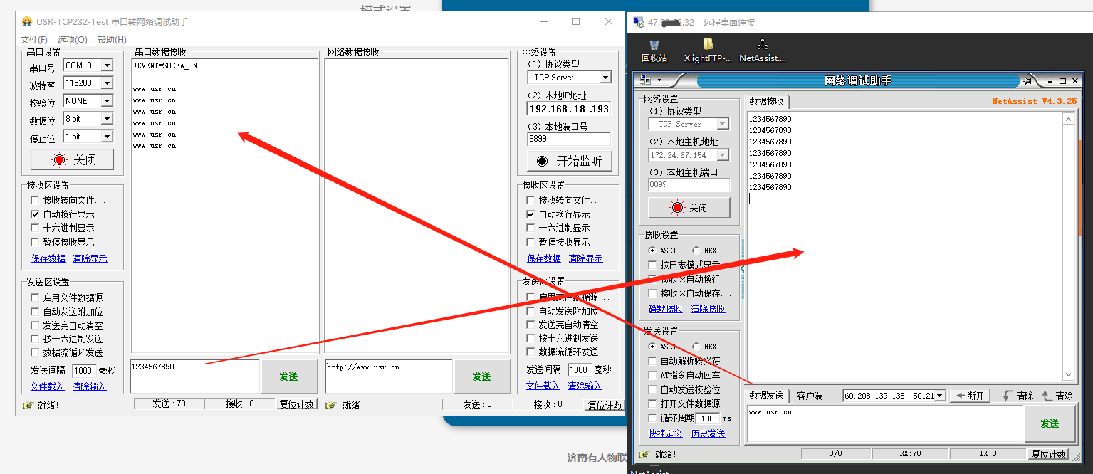 串口發(fā)送數(shù)據(jù)1234567890,遠(yuǎn)程網(wǎng)絡(luò)接收1234567890。