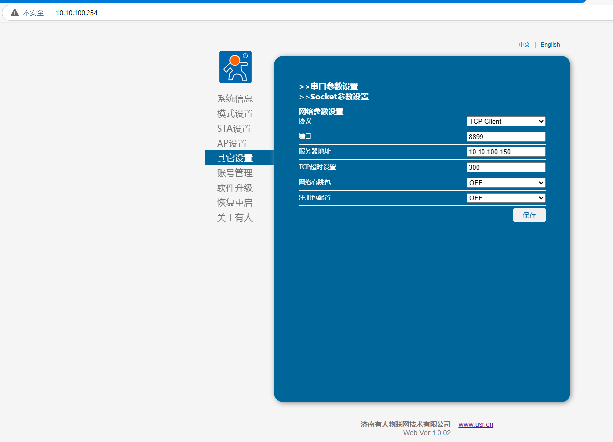 瀏覽器輸入10.10.100.254,用戶名和密碼都是admin,登陸USR-DR164網(wǎng)頁(yè)。
