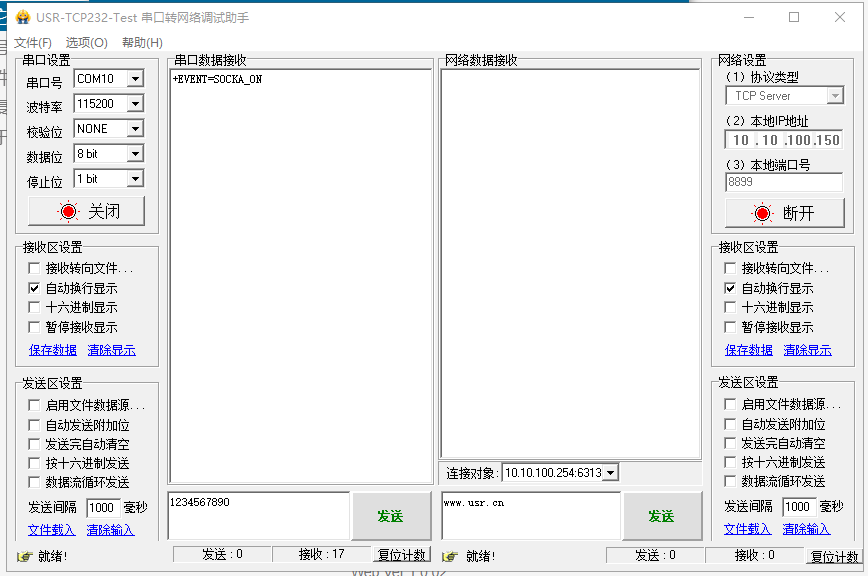 串口發(fā)送數(shù)據(jù)1234567890,網(wǎng)絡(luò)接收1234567890。