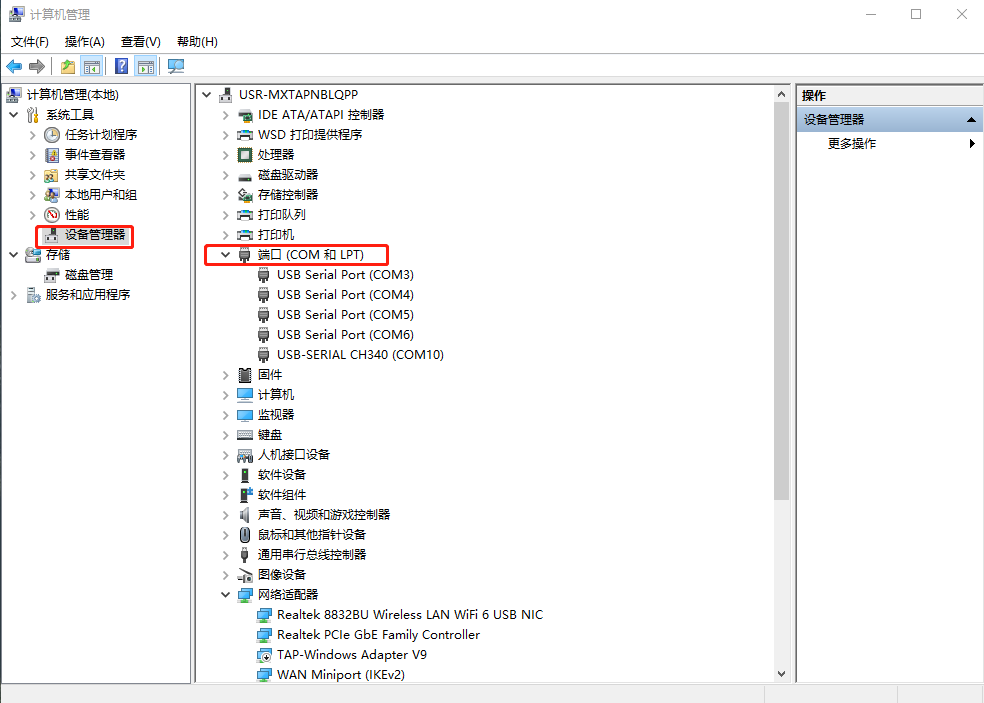點(diǎn)擊電腦計(jì)算機(jī),右擊點(diǎn)擊管理,點(diǎn)擊設(shè)備管理器,點(diǎn)擊端口,確認(rèn)USB-RS485串口線的COM口號(hào)COM10。