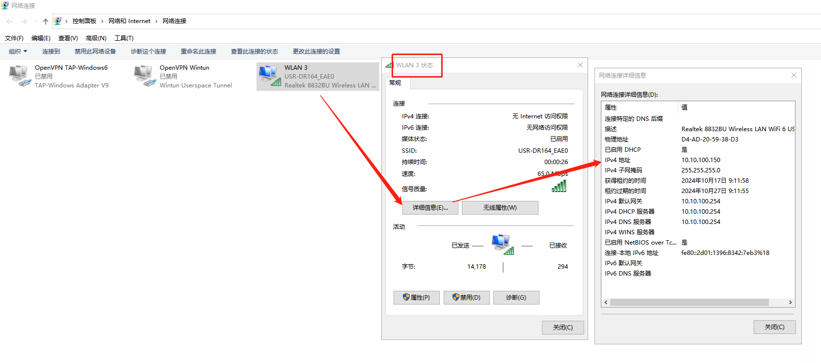 電腦關閉防火墻,禁用其他網(wǎng)卡,只保留無線網(wǎng)卡,電腦搜索連接USR-DR164的WiFi。連接之后,電腦打開控制面板,網(wǎng)絡和Internet,網(wǎng)絡連接,查看無線網(wǎng)卡狀態(tài),IPv4地址是10.10.100.150