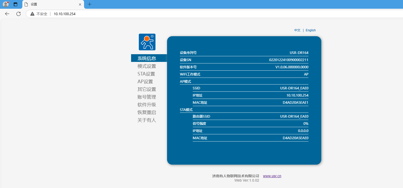 瀏覽器輸入10.10.100.254,用戶名和密碼都是admin,登陸USR-DR164網(wǎng)頁。