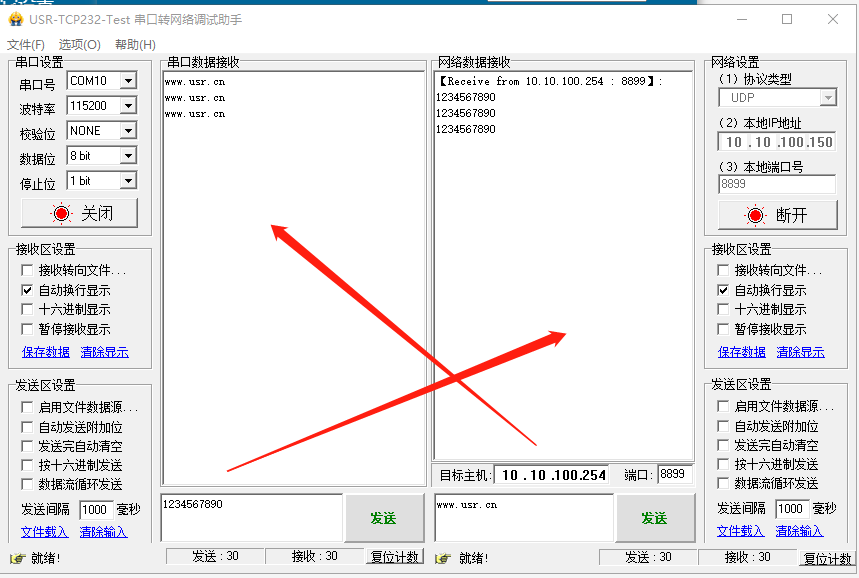 串口發(fā)送數(shù)據(jù)1234567890,網(wǎng)絡接收1234567890。