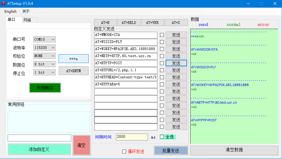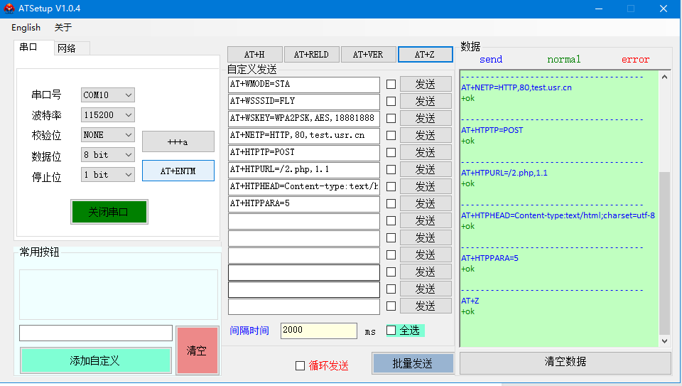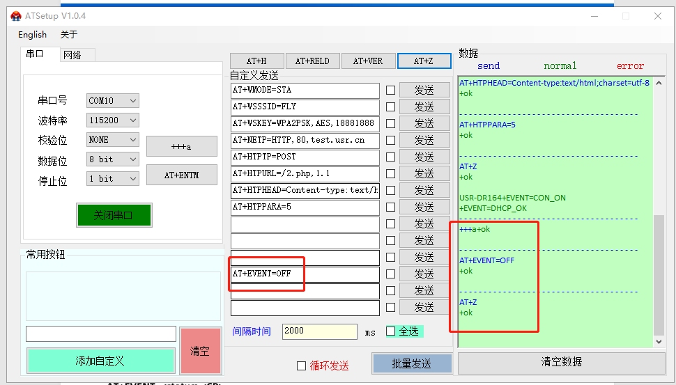 1、打開ATSetup 軟件,選擇COM口號(hào)COM10 ,波特率115200,打開串口,點(diǎn)擊+++a,依次發(fā)送以下AT指令: