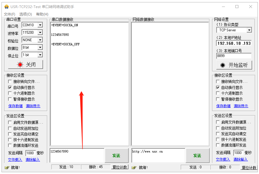 在電腦上用USR-TCP232-TEST軟件測(cè)試,打開對(duì)應(yīng)的COM口,測(cè)試串口發(fā)送數(shù)據(jù)1234567890到我們測(cè)試服務(wù)器,測(cè)試服務(wù)器返回?cái)?shù)據(jù)數(shù)據(jù)帶EVENT信息(透?jìng)髂J较率录ㄖδ苣J(rèn)開啟)和數(shù)據(jù)1234567890。