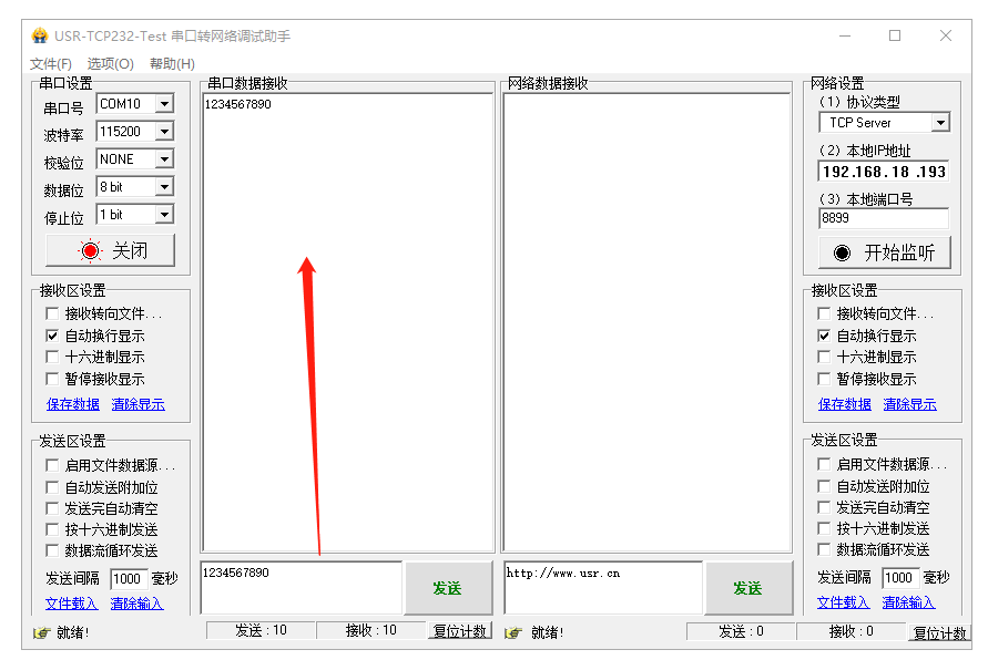 (3)在電腦上用USR-TCP232-TEST軟件測(cè)試,打開對(duì)應(yīng)的COM口,測(cè)試串口發(fā)送數(shù)據(jù)1234567890到我們測(cè)試服務(wù)器,測(cè)試服務(wù)器返回?cái)?shù)據(jù)數(shù)據(jù)1234567890。