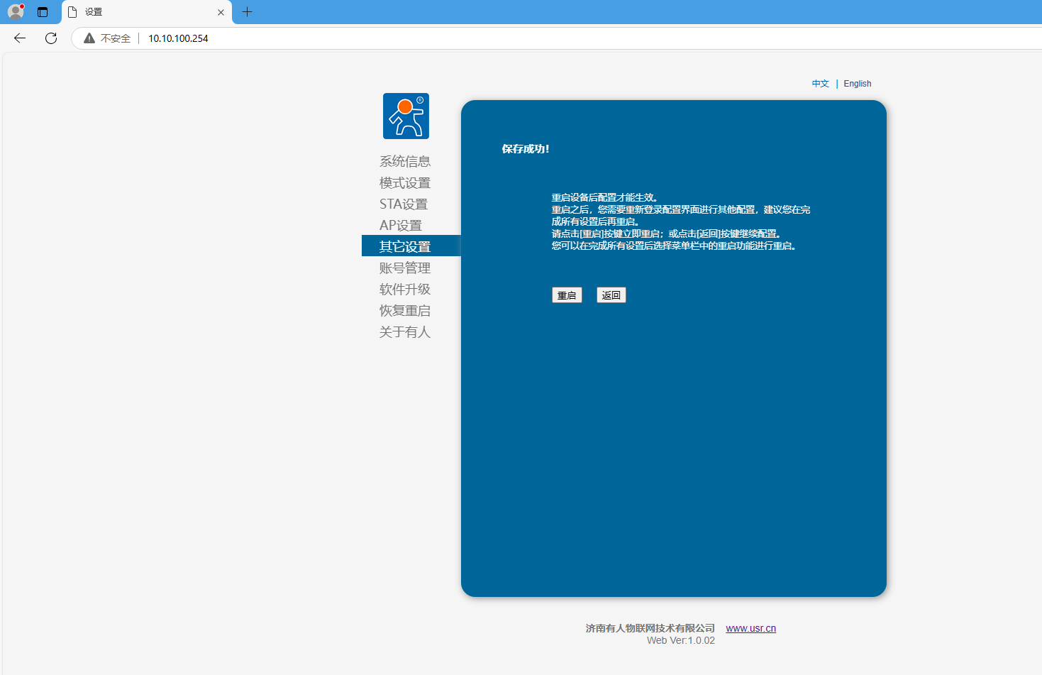 瀏覽器輸入10.10.100.254,用戶名和密碼都是admin,登陸USR-DR164網(wǎng)頁。