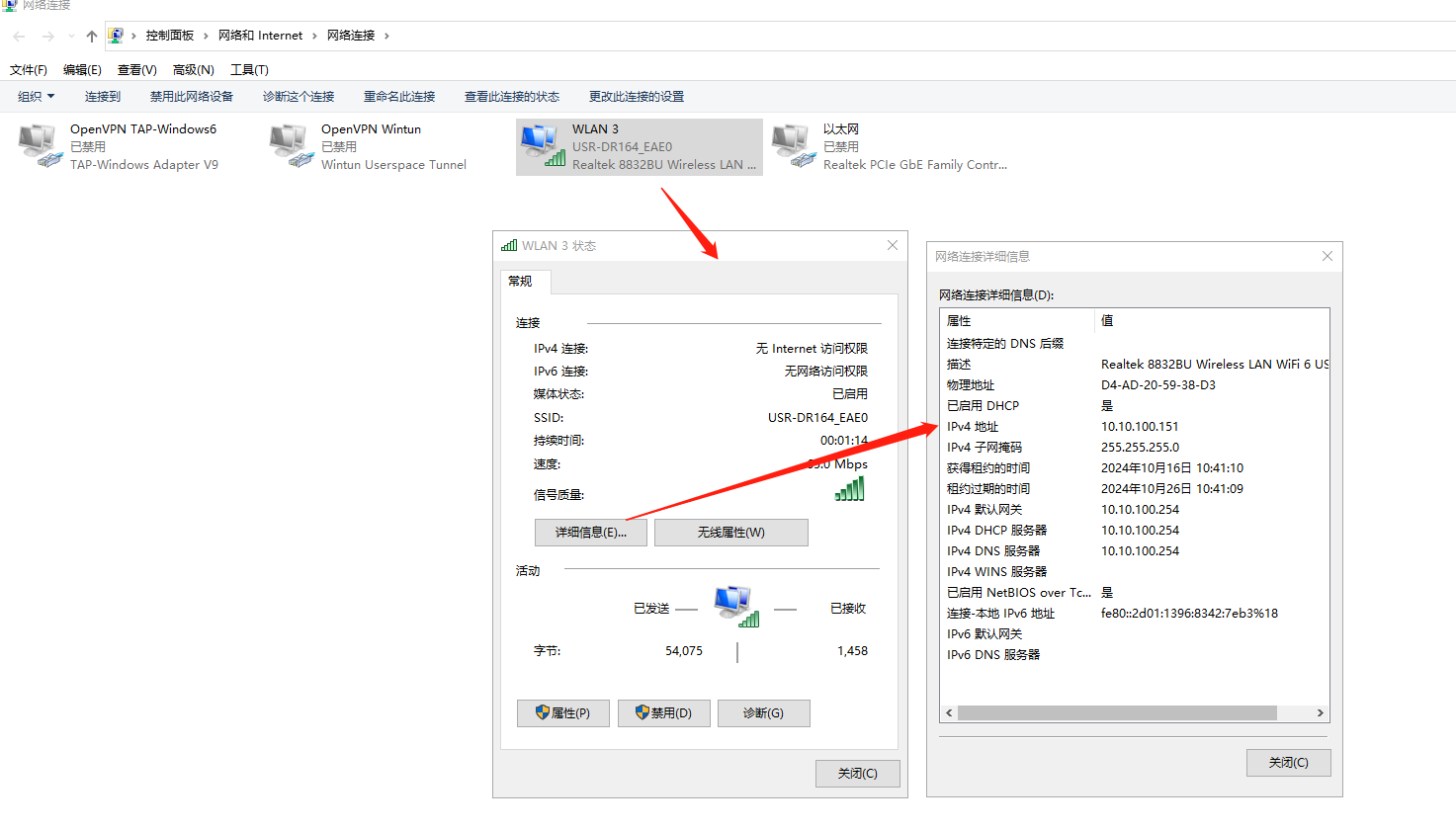 電腦關閉防火墻,禁用其他網(wǎng)卡,只保留無線網(wǎng)卡,電腦搜索連接USR-DR164的WiFi。連接之后,電腦打開控制面板,網(wǎng)絡和Internet,網(wǎng)絡連接,查看無線網(wǎng)卡狀態(tài),IPv4地址是10.10.100.151