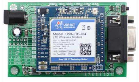 將4G模塊USR-LTE-7S4安裝在測試底板上,安裝上天線,將SIM卡槽打開,正確放入SIM卡,使用USB轉(zhuǎn)RS232的串口線(公頭)與測試底板對(duì)接上。