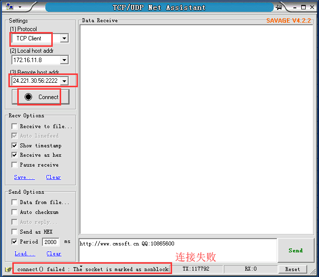 服務器IP和端口號是:27.221.30.56:2222,經(jīng)過百度可以得知這個IP確實是公網(wǎng)IP地址,那我們可以用PC端軟件測試下這個IP和端口是否可連接的,PC端軟件做TCP client,然后設(shè)置遠程服務器地址,點擊“Connect”,可見連接失敗,這說明這個服務器是有問題的,如果PC端軟件連接不上的話,那么DTU也是無法連接成功的,但是服務器具體是有什么問題,需要跟服務器端的工程師來確認,我們作為DTU的供應商,沒法判斷服務器端的問題的。