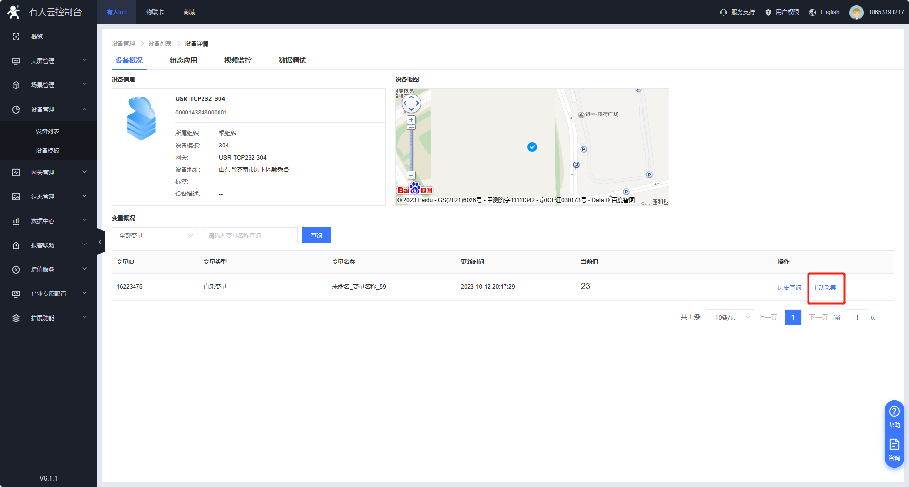 3、在有人云平臺上找到對應(yīng)的設(shè)備,點(diǎn)擊數(shù)據(jù)查看-主動采集??梢栽谟腥嗽破脚_查看設(shè)備傳輸?shù)拇跀?shù)據(jù)。
