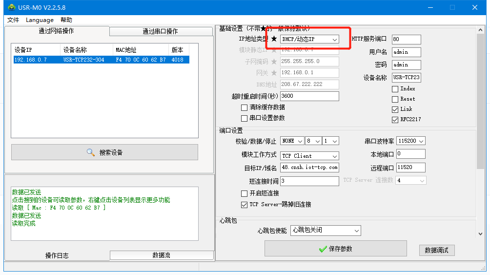 4、IP地址類型更改為DHCP/動態(tài)IP,設(shè)置完成后通過網(wǎng)線將304的網(wǎng)口接到路由器LAN口上面,給設(shè)備供網(wǎng)。工作方式選擇TCP Client,目標(biāo)IP:自己的云平臺接入地址,遠(yuǎn)程端口號:15000,設(shè)置完成后點(diǎn)擊保存參數(shù)。