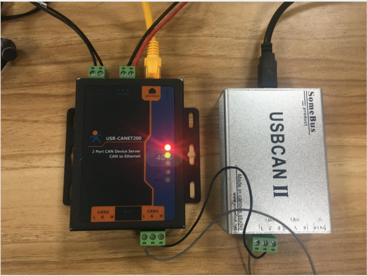 將USR-CANET200接上標(biāo)準(zhǔn)的電源適配器(端子供電),通過網(wǎng)線直連的方式,連接到電腦,將can轉(zhuǎn)usb的can1接到cannet200的can1口上,usb口接電腦usb口,485轉(zhuǎn)usb一端接can的485口,一端接電腦usb口。
