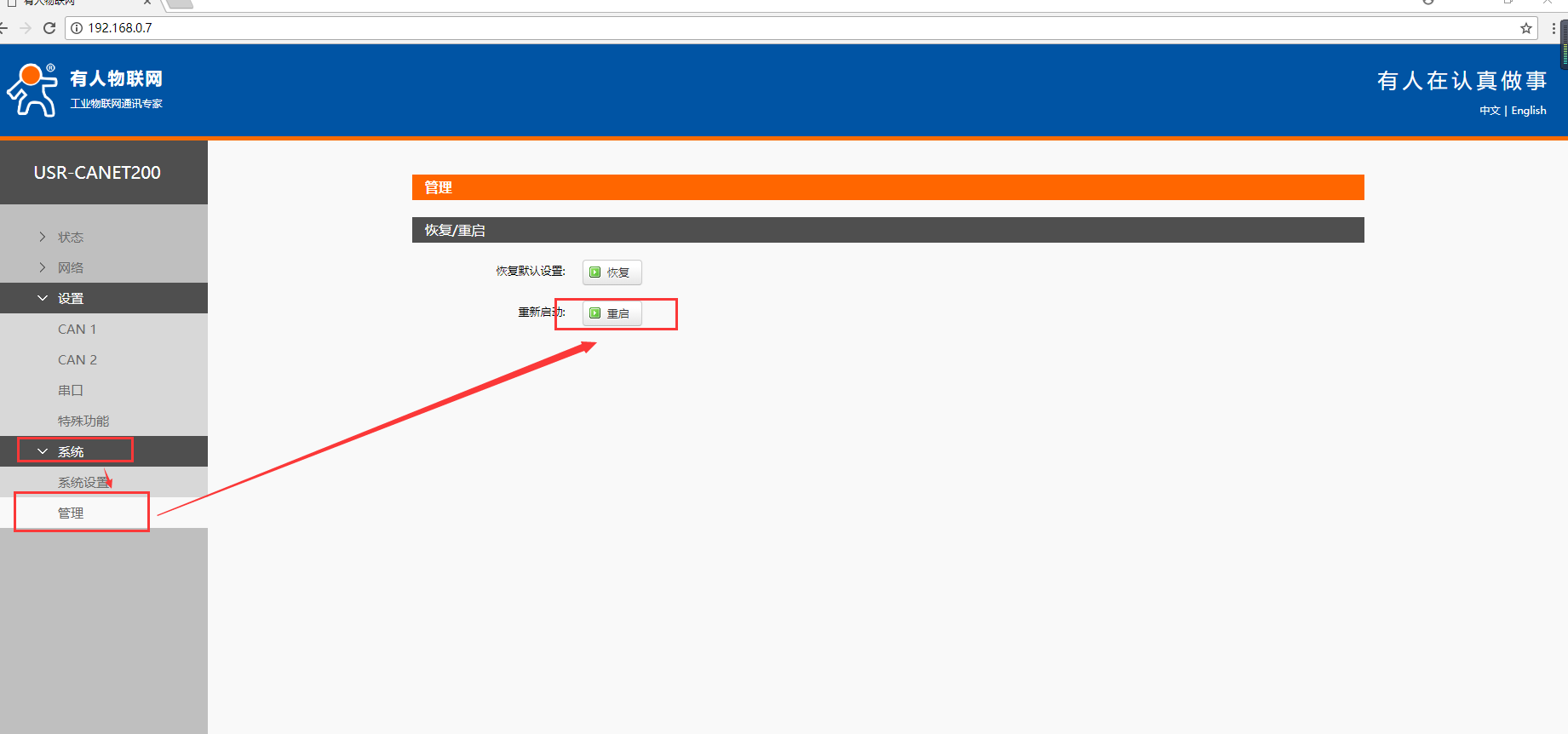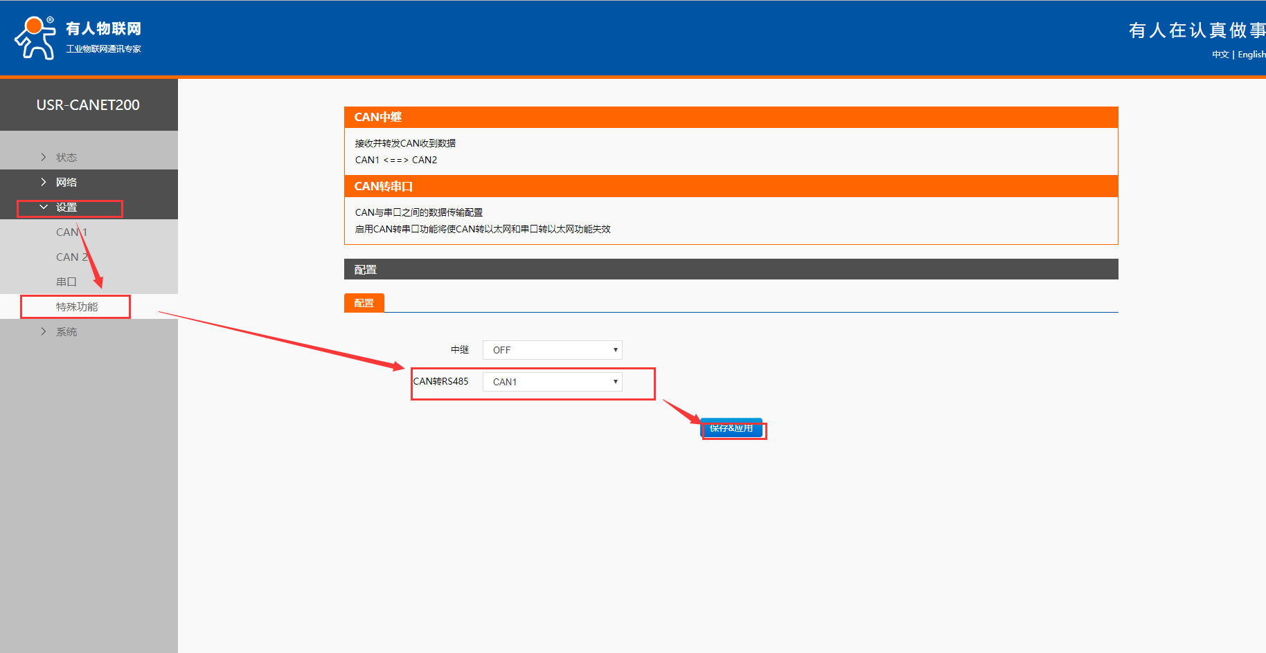 2. 瀏覽器輸入地址192.168.0.7,進(jìn)入canet200的內(nèi)質(zhì)網(wǎng)頁,選擇設(shè)置->特殊功能->can轉(zhuǎn)485->打開can1,如圖所示,然后重啟。