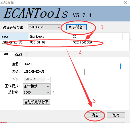 選擇設(shè)備類型為“USBCAN-V5”然后打開設(shè)備選擇Can1,點擊確定