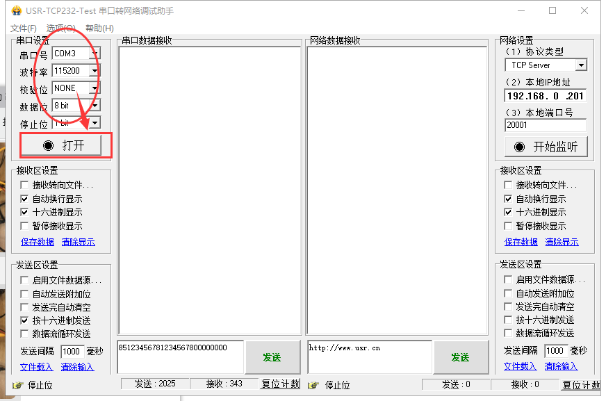 4. 打開USR-TCP232-test串口轉(zhuǎn)網(wǎng)絡(luò)調(diào)試助手,左側(cè)選擇已連接的com口,波特率為115200,校驗位none,數(shù)據(jù)位8bit,停止位1bit,單擊打開。