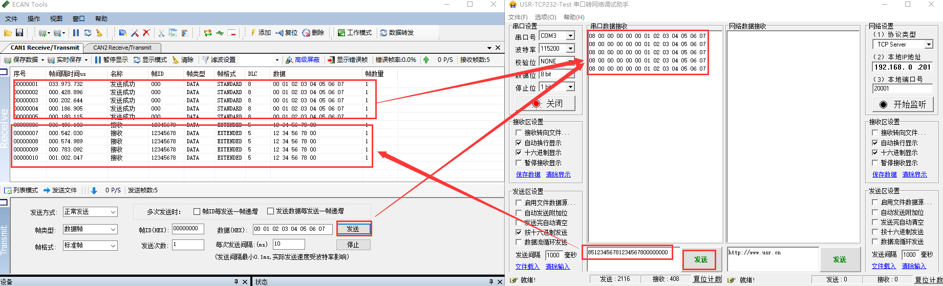 5. CAN協(xié)議數(shù)據(jù):85123456781234567800000000、05000006781234567800000000,日圖所示,實現(xiàn)485轉(zhuǎn)can的通信。