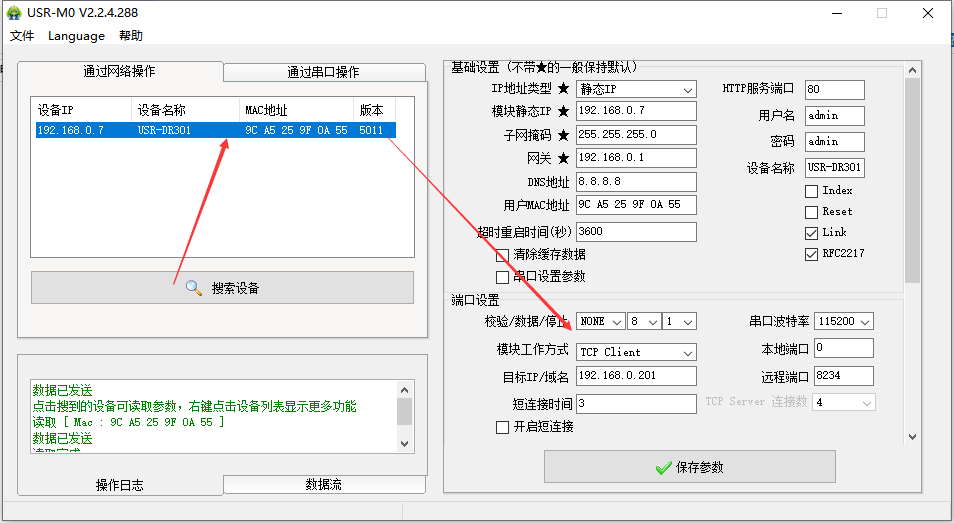 點(diǎn)擊“搜索設(shè)備”當(dāng)搜索列表中出現(xiàn)301的設(shè)備后,單擊搜索到的設(shè)備,查看其配置信息(下圖為默認(rèn)配置信息)。