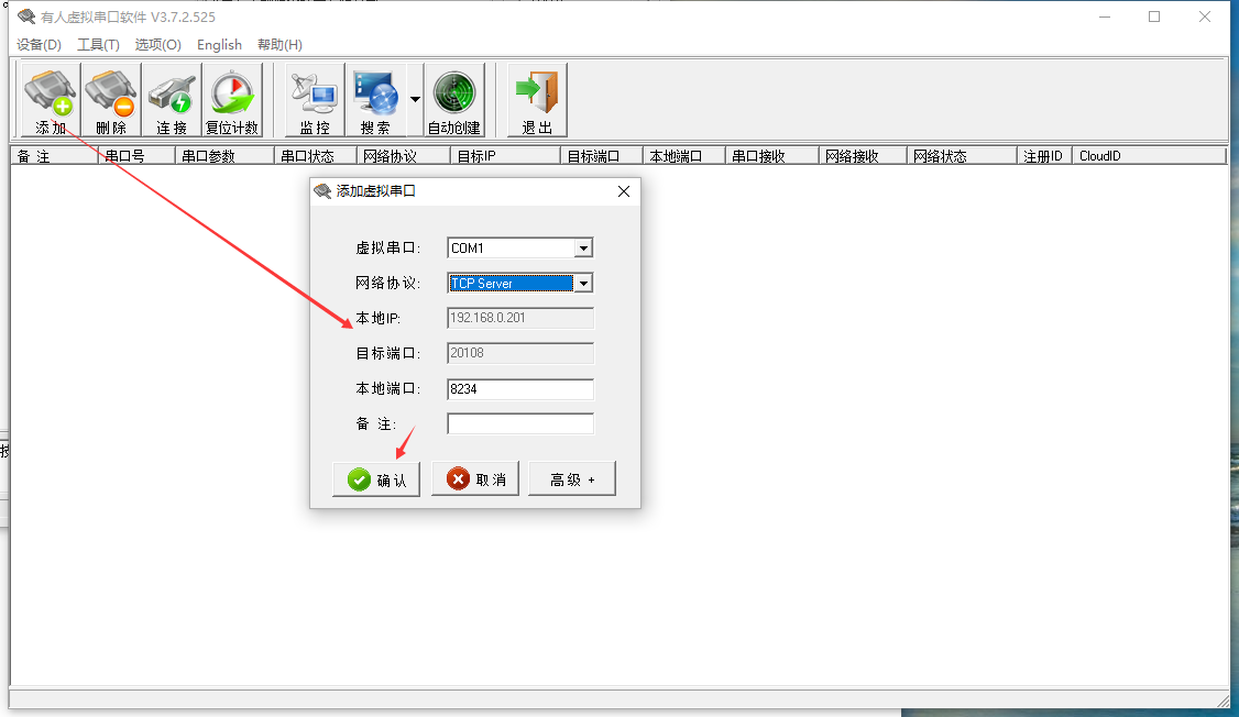 打開虛擬串口軟件,點(diǎn)擊“添加”在彈出的窗口中設(shè)置虛擬串口信息,由于上述301設(shè)備采用TCP Client協(xié)議,所以此處網(wǎng)絡(luò)協(xié)議設(shè)置為TCP Server。本地端口號(hào)設(shè)置為301默認(rèn)參數(shù)中的“遠(yuǎn)程端口”:8234。然后點(diǎn)擊“確定”,建立虛擬串口COM1。