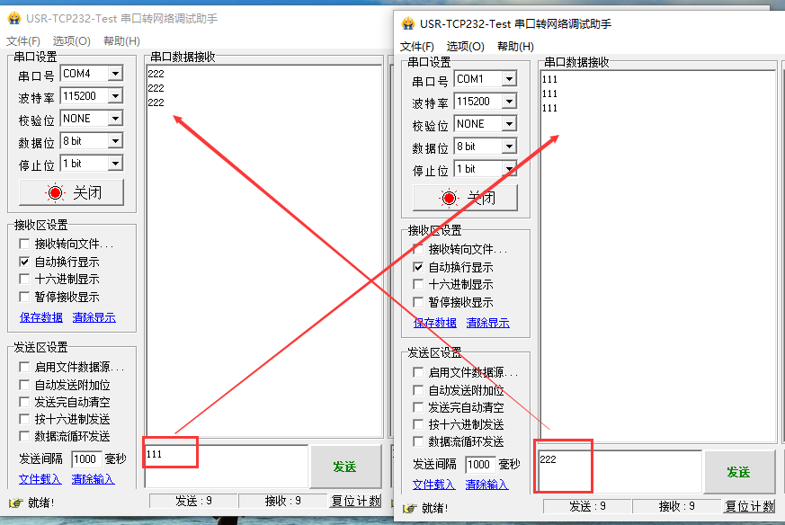 8、打開兩個(gè)USR_TCP232_Test軟件,一個(gè)連接COM4,一個(gè)連接虛擬串口COM1,實(shí)現(xiàn)兩個(gè)串口直接數(shù)據(jù)互發(fā)。