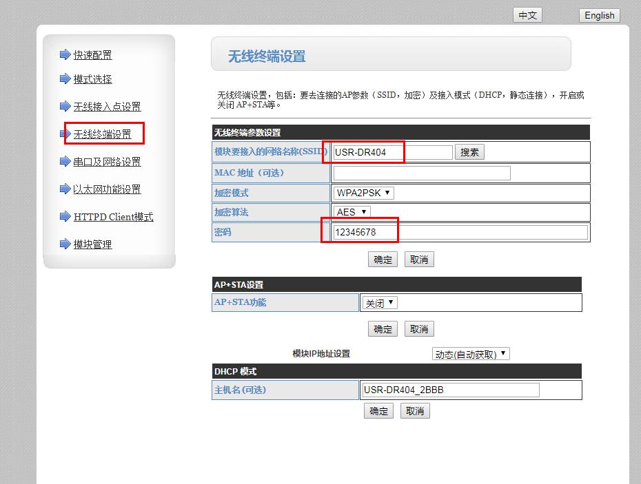 6、第二個(gè)USR-DR404配置STA模式參數(shù):
