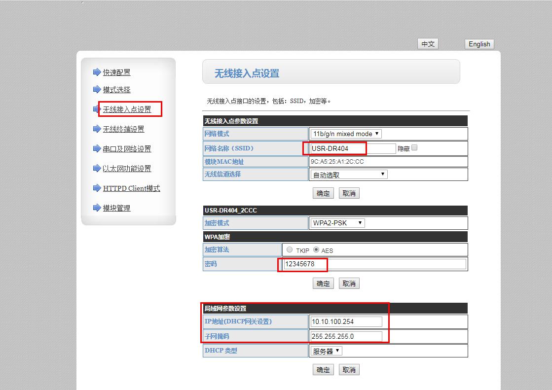 在網(wǎng)頁上將工作模式設(shè)置為AP模式,保存參數(shù)。DR404 IP默認(rèn)10.10.100.254。