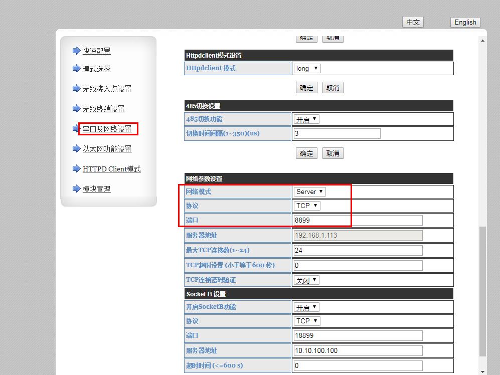 在串口及網(wǎng)絡(luò)設(shè)置,設(shè)置串口參數(shù),設(shè)置工作模式設(shè)置TCP server模式。本地端口8899。