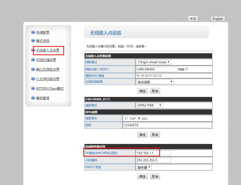 5、第一個(gè)USR-DR404配置AP模式參數(shù):