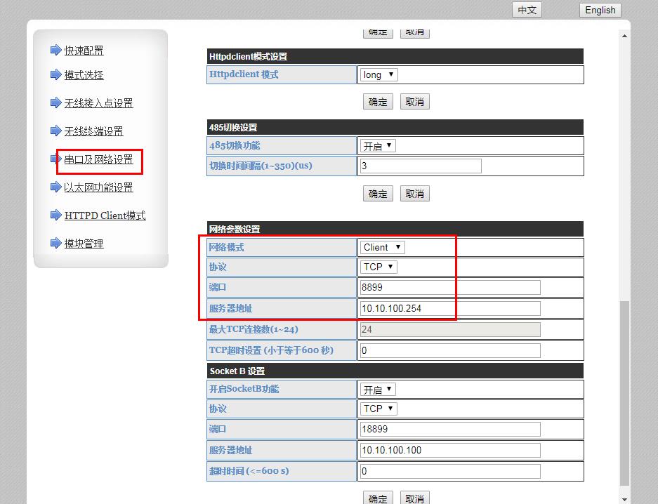 在串口及網(wǎng)絡(luò)設(shè)置,設(shè)置串口參數(shù),設(shè)置工作模式設(shè)置TCP client模式。本地端口8899。