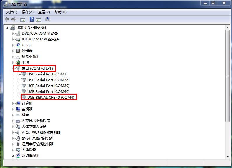 將兩個(gè)USB-RS485串口線接電腦USB口,在電腦上設(shè)備管理器中,查看USB-RS485線的串口號(hào),是COM4、COM1。