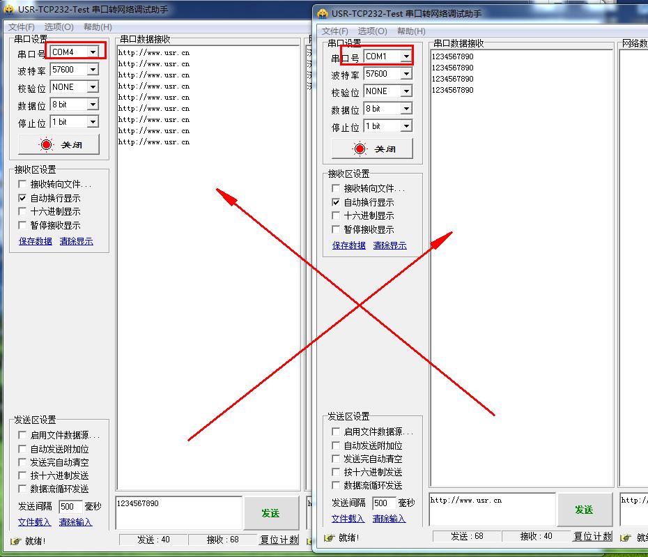 等待兩個(gè)DR404的LINK燈亮了之后,用兩個(gè)串口助手,分別打開COM1 和COM4