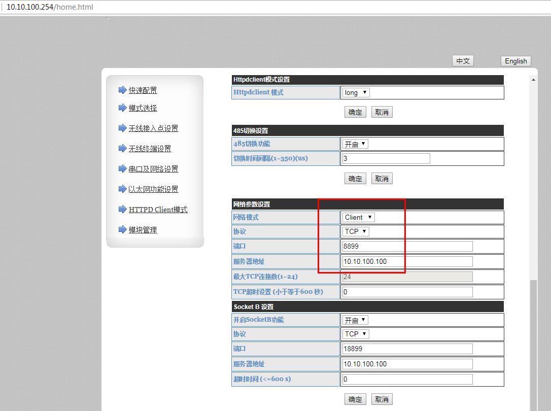 DR404在網(wǎng)頁(yè)上,串口及網(wǎng)絡(luò)設(shè)置,設(shè)置網(wǎng)絡(luò)模式TCP client,服務(wù)器IP填電腦IP10.10.100.100,端口填8899。保存參數(shù),重啟DR404
