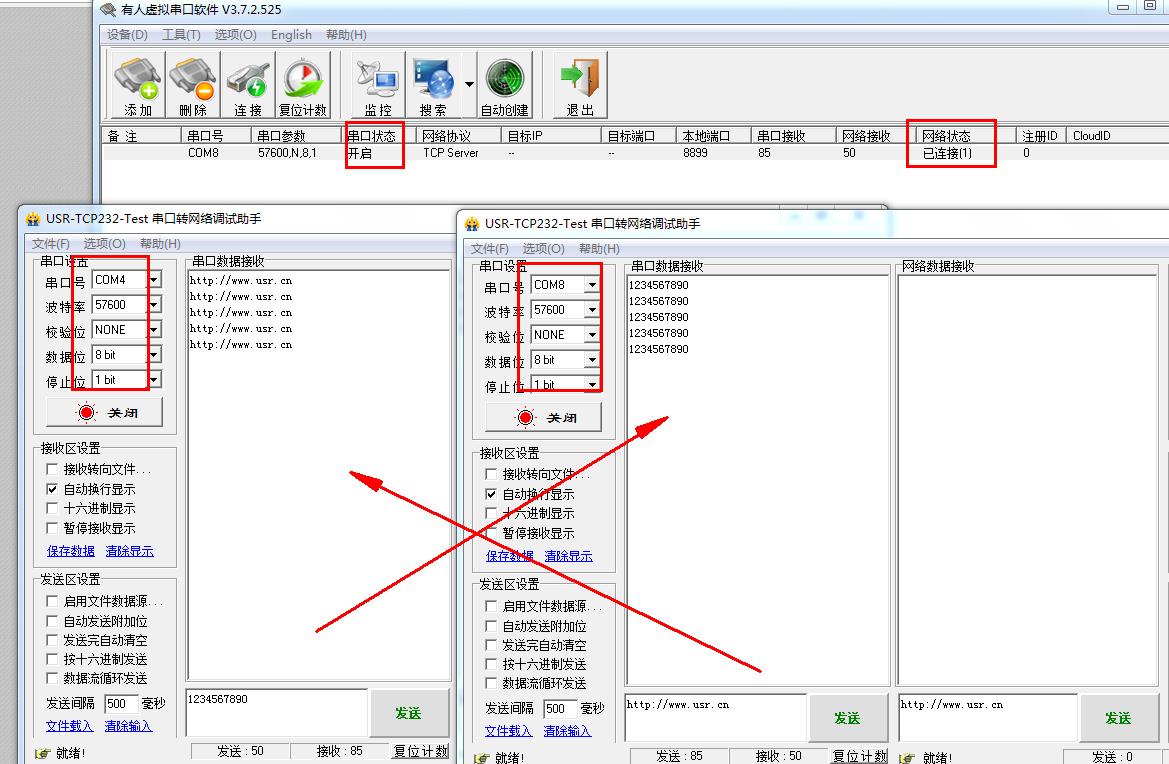 然后用兩個(gè)USR-TCP232-TEST測(cè)試串口和虛擬串口之間的數(shù)據(jù)傳輸。