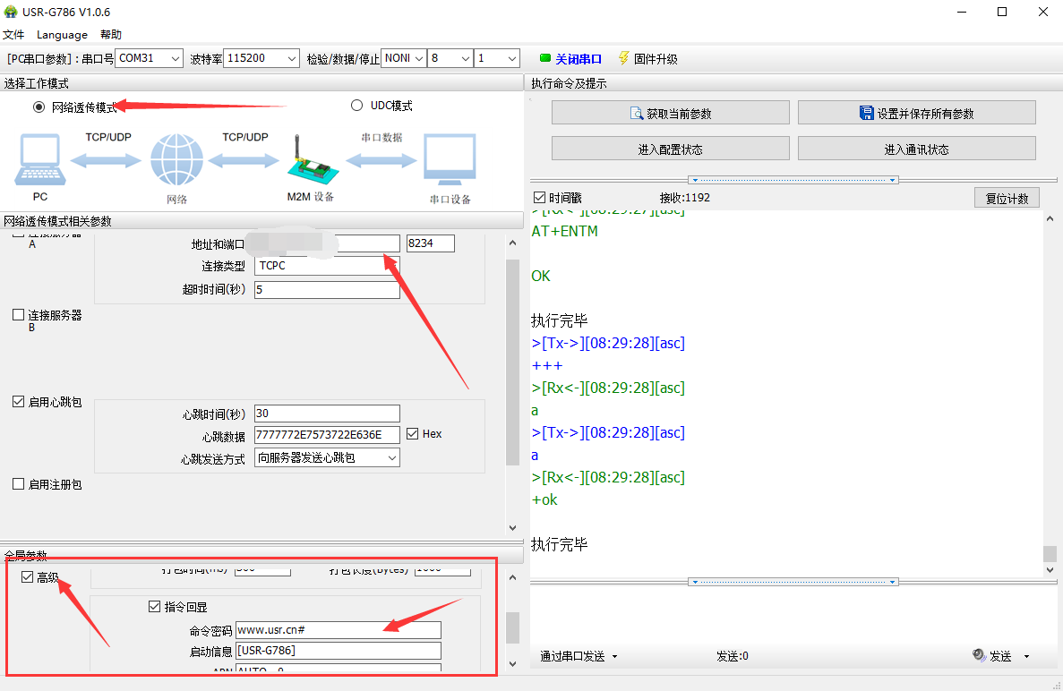 2.選擇網絡透傳工作模式,填寫要連接的服務器的IP和端口號,勾選高級查看命令密碼(命令密碼可以自定義)